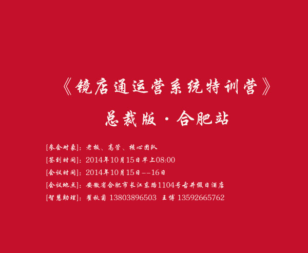 号外,号外:受安徽天道贵人的强烈要求,阳光视线《镜店通运营系统特训营》总裁版将于10月15日-16日隆重走进合肥。“村长”两天一夜的倾心分享,精彩不容错过!