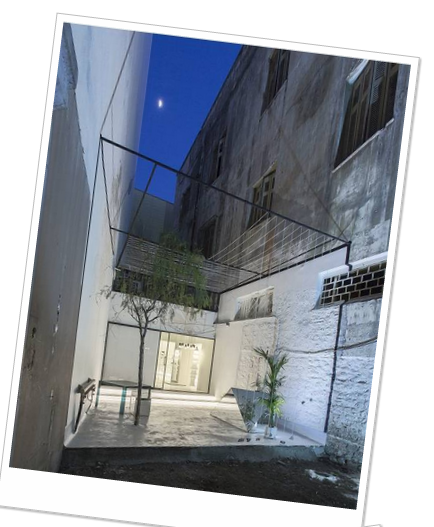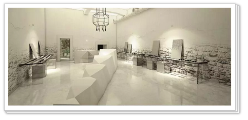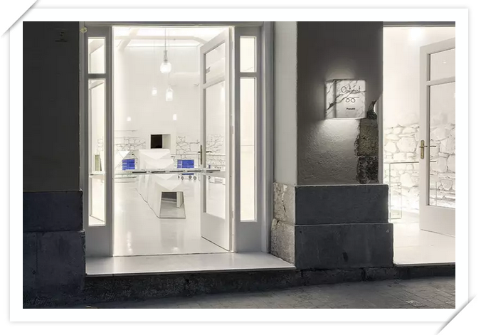 从店铺门面到内部,一直到里面的庭院和天井,你都能看到斑驳而不平整的墙面,有饱经风霜之感。入口是两个拱门,亦常见于地中海地区;店铺招牌挂在拱门之间,很小,部分墙面甚至已经脱落,设计师却不作处理,似乎只想向来者强调:这里记载了一些故事。
