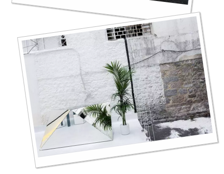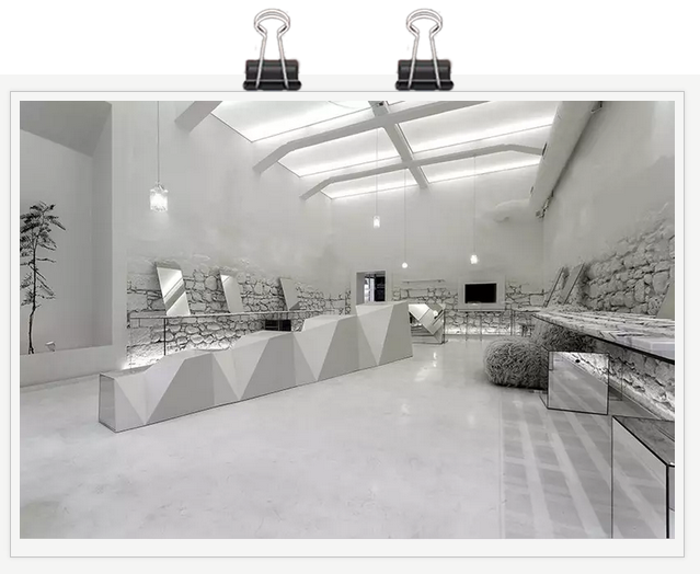 最显眼的可能是墙面,上半部平整,下半部凹凸不平,时间将砖块打磨出不同形状,使它们成为很好的装饰,视觉效果突出。店铺中央不规则几何体制成的白色家具和无处不在的镜面,又使得眼镜店平添几分未来感。