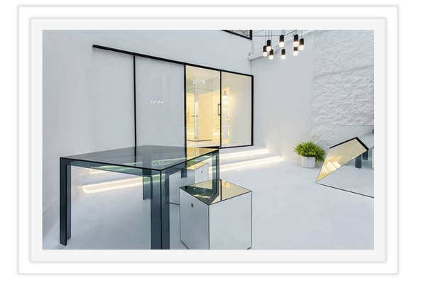 走进店铺,整个室内都为白色,除了垂下来的吊灯,天花板和墙面、地面都有专门的照明设备。桌面、地面上大量摆放各式各样的镜子和镜面,将空间反射得更加明亮,顾客也可以多角度观察自己戴上眼镜的样子。