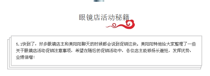 1、经过周密计划和严谨执行的促销活动,对于促进眼镜店的业绩是有积极的贡献的,在一些关键时刻,例如节假日或者销售旺季,有效的促销活动是需要的。