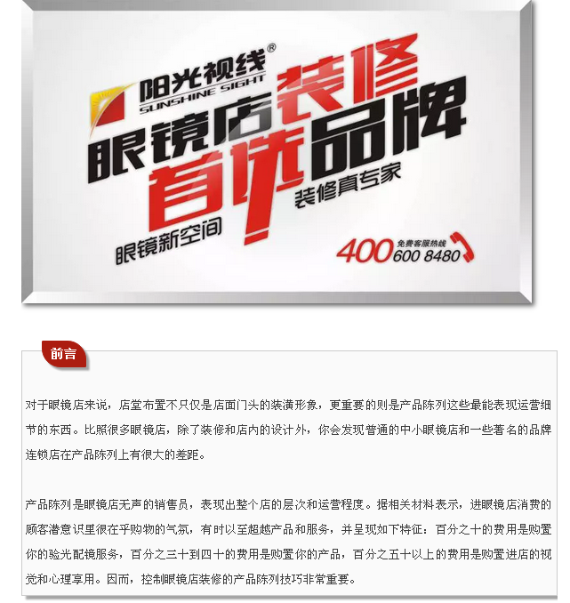 事实上,好的产品陈列对销售有较好的促进作用。比方大型超市就经常变化内部商品的陈列格局,营造好的销售氛围。遗憾的是目前很多的眼镜店单纯强调销售人员的作用,无视店内产品陈列的强大辅助作用。