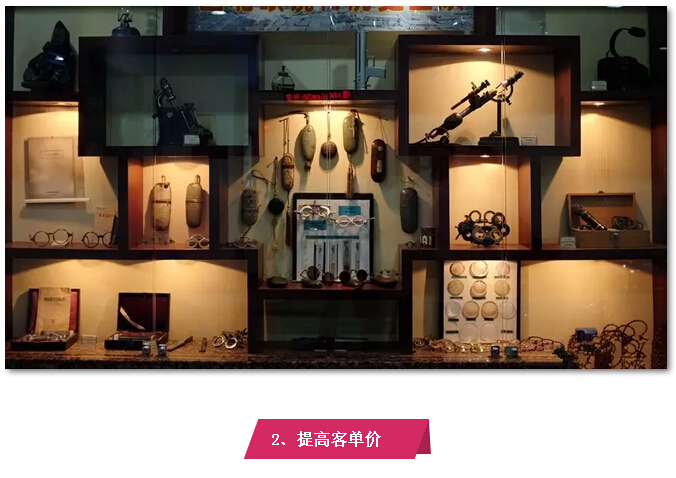 通过货品的合理陈列会提高客单价。首先我们要了解本店的磁场带,所谓磁场带就是顾客经常习惯性到在店铺停留最多的地方,那么磁场带可以放一些高于平均单价的货品,这样,顾客最经常挑的产品就是单价略高于平均单价的商品,再加上销售员的引导,就有利于提高本店的平均单价!