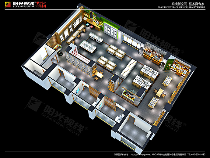 整体上,店铺布局合理,功能区划分明确,验光室、治疗室等隐藏在店铺后方,充分考虑心理、人文、地理等因素,一切以顾客为中心,既满足了顾客配镜需求,又不会占用店铺空间资源,给人一种专业可靠的感觉。