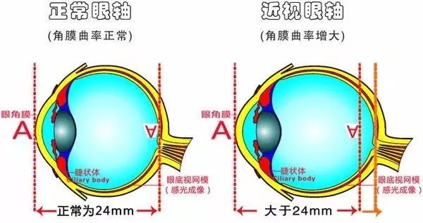 正常眼球的眼轴直径大约为24mm,大于24mm为近视,小于24mm则为远视。