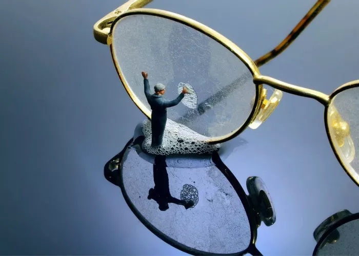 先用清水冲掉镜片上的灰尘颗粒,滴几滴中性清洗剂,用指肚轻轻揉搓后,用清水冲洗干净,最后用无屑的面巾纸将水分吸干。