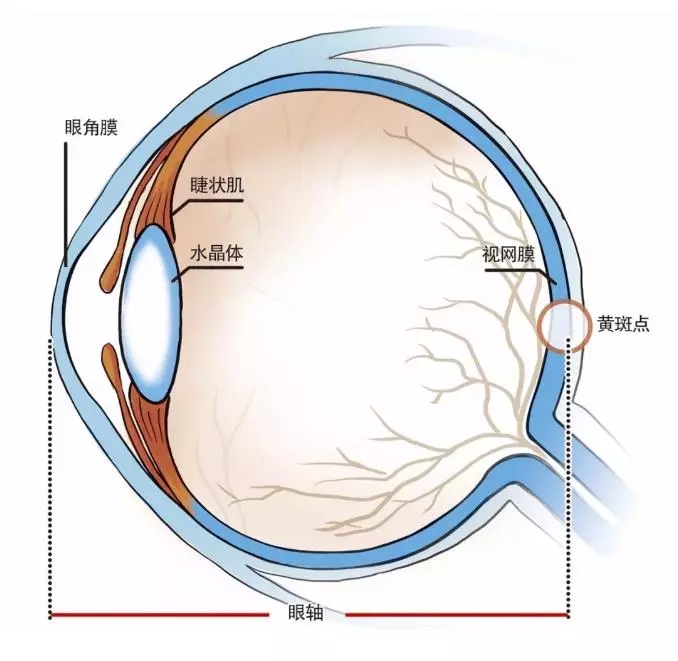 把眼睛看成一台光学仪器来描述:从眼球接收光线的最表层到感受光线最里的一层(即从角膜-晶状体-玻璃体-视网膜)的距离,看成是物理中的光学系统的一条中轴线,这就是所谓“眼轴”。