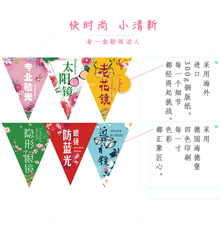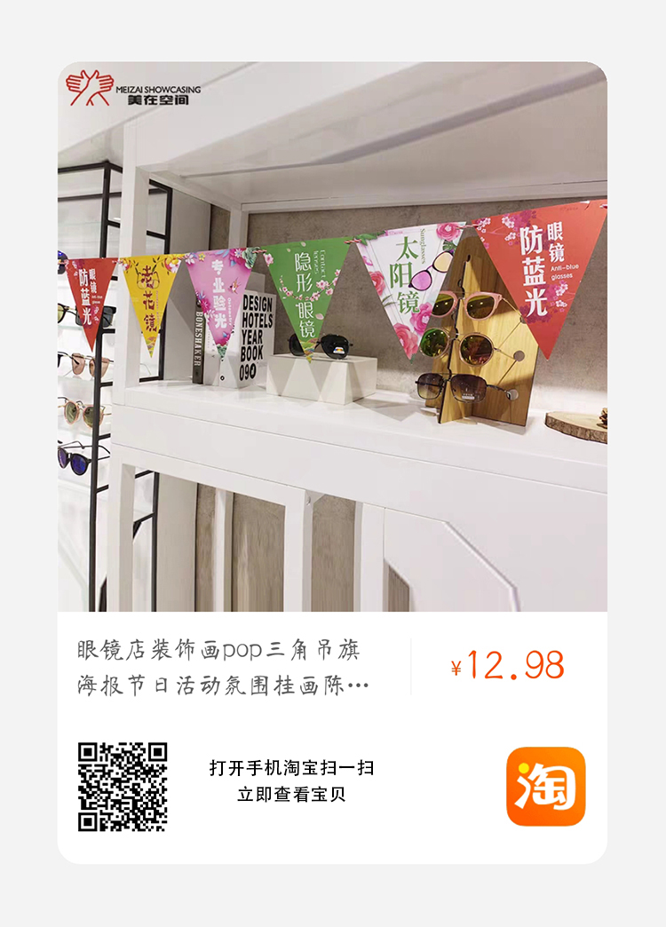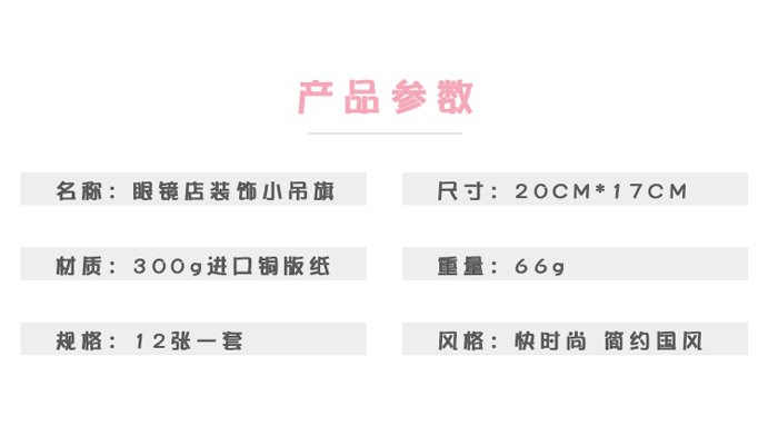 品牌: 美在空间 风格: 中国风 尺寸: 20cm*17cm 外框类型: 12张一套 颜色分类: 近视镜 太阳镜 专业验光 老花镜 防蓝光 组合形式: 2.5米彩绳+12面吊旗