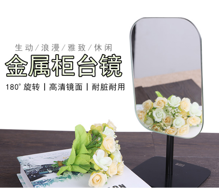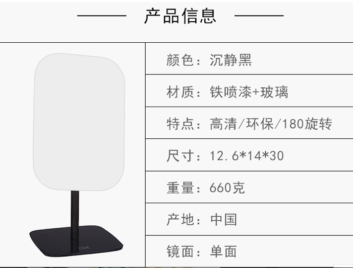 品牌: 美在空间风格: 欧式流行元素: 纯色适用空间: 化妆间颜色分类: 沉静黑 高端灰商品类型: 个人洗漱/清洁/护理镜框材料: 金属货号: 金属方镜镜面材质: 银化妆镜类型: 台式单面镜