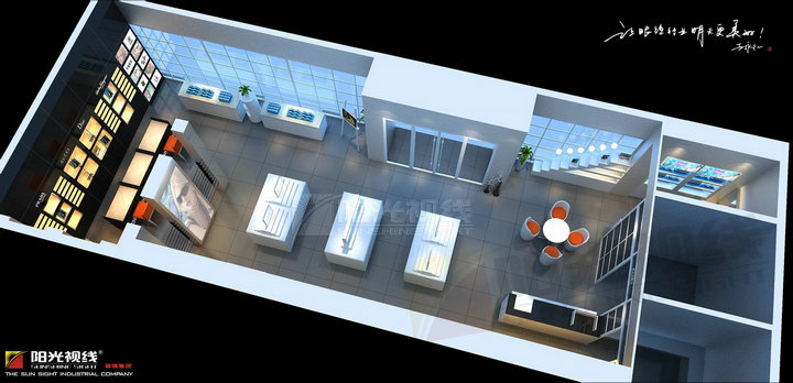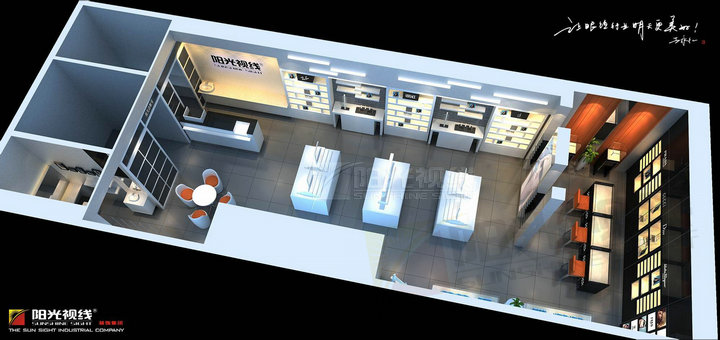 眼镜店的整体设计上通常包括验光室、配镜室、大厅、服务台4个部分,验光室一般没有特殊的要求,但要有足够的长度,视力检查至少要达到5米,不够的话可以通过放置平面镜以保证,同时验光室宜使用间接光源、空气流通、整洁清静。配镜室里面装有很多精密的仪器、配件、消毒水池这些,因此通常装修价格较高,注意对仪器的维护。大厅是展现给客人最基本最实在的部分,各种眼镜样品都在这里展示给顾客,因此此处的精品装修是非常重要的,也是提升一个眼镜店身价的保障。服务台要有淡淡的文化气息,给顾客别样的温馨,也要提供热情的服务。