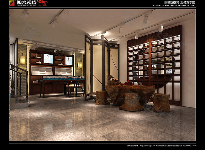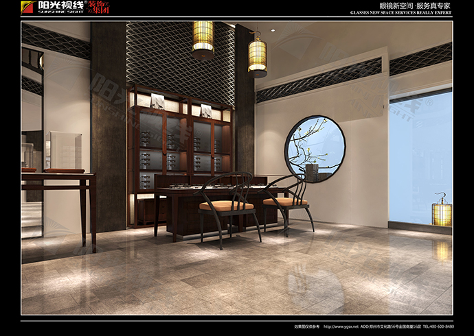 新中式眼镜店是对传统中式风格的一种提炼及升华,虽然具有现代气息,但在设计中依然能够看到中国传统古典文化的痕迹,如字画、匾幅、挂屏、盆景、瓷器、古玩、屏风、博古架等,使空间显得更具有东方禅味的意境!