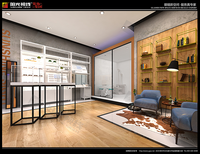 像眼镜店会客区的装扮、顶部吊顶,背景墙这些区域的设计,一定程度都对商品销售有促进作用!