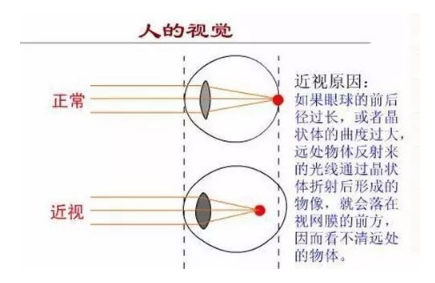 大家都知道我们的视力和聚焦有关,事实上,近视者的眼球会稍稍伸长,比正常人的眼球要“胖”一些,因此晶状体会将远处物体的像汇聚到视网膜之前,而不是视网膜之上,最终导致眼睛看不清楚远处物体。