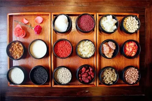 传统的腊八粥的原料一般有糯米、桂圆、莲子、百合、红枣、花生、红豆、核桃仁这8种食材,每种食材都富有不同的传统意义,有的寓意吉祥,有的寓意圆满,这些食材的选择除抵御严寒和有益健康以外,更体现出民以食为天并通过寓意吉祥的食材祈求生活美满的愿望。