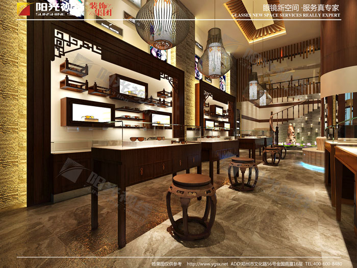 功能:时尚复古套餐展示、品牌镜架展示、国际精品展示、品牌隐形眼镜展示及附件展示、配镜客户验光室、加工区、斜弱视训练室、休闲水吧台、经理办公室。